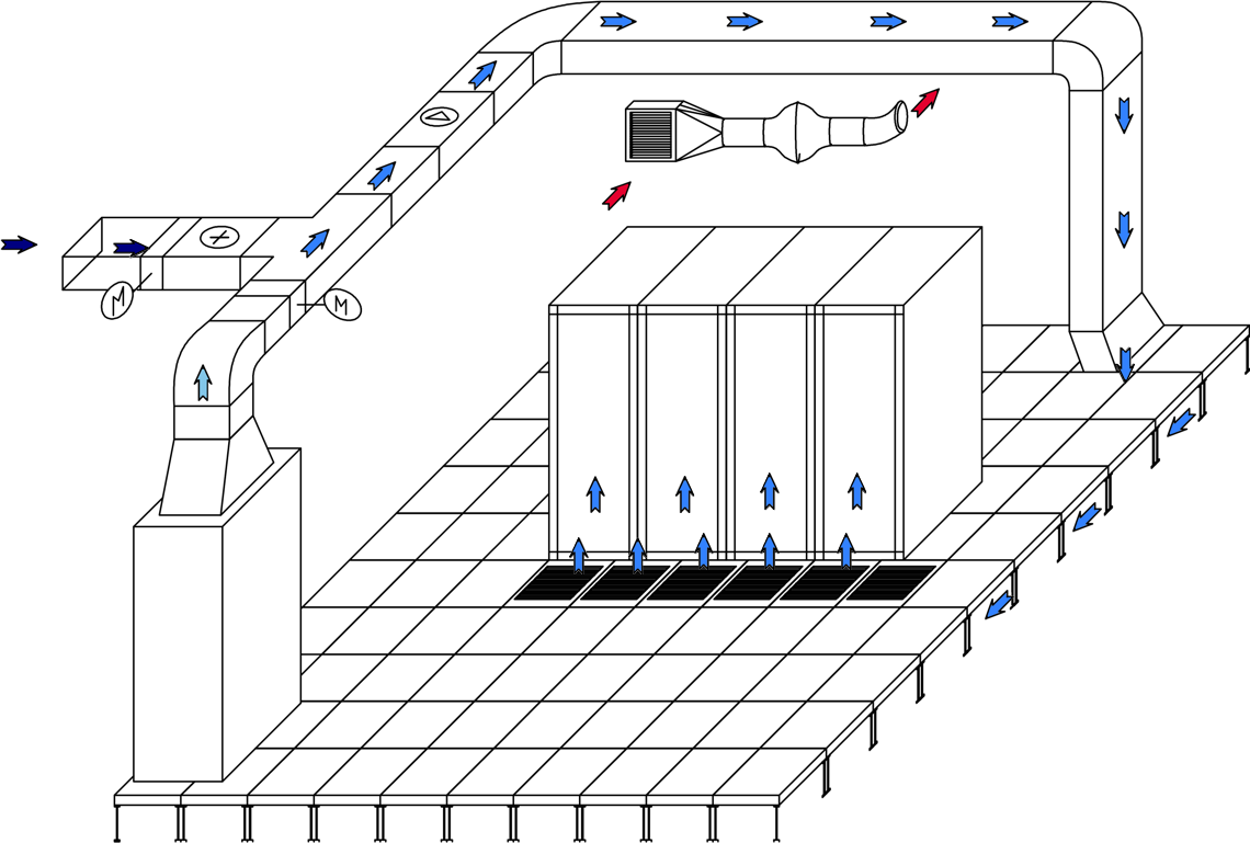 С помощью системы воздуховодов и вентиляционных решёток мы можем распределить поток воздуха непосредственно к каждой стойке и изменить расход воздуха в зависимости от тепловой загруженности каждой из стоек.